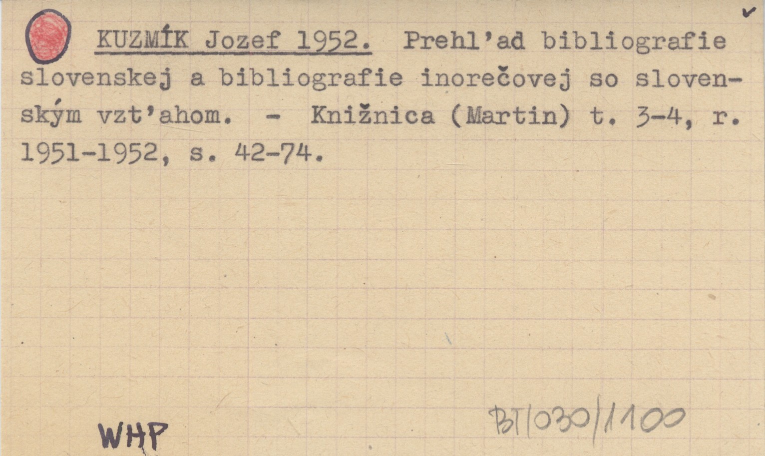 KUZMÍK Jozef 1952 Prehľad bibliografie slovenskej a bibliografie inorečovej so slovenským vzťahom.