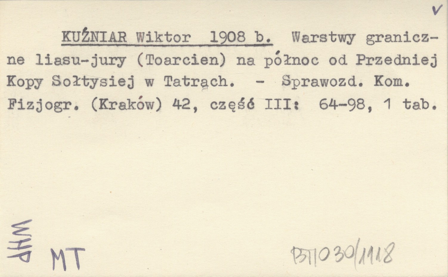 KUŹNIAR Wiktor 1908 b Warstwy graniczne liasu-jury (Toarcien) na północ od Przedniej Kopy Sołtysiej w Tatrach.