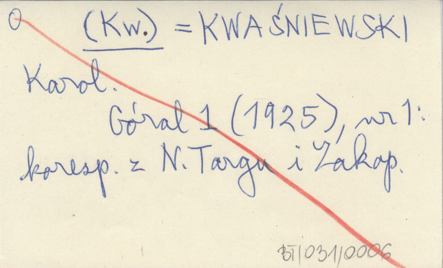 (Kw.) KWAŚNIEWSKI Karol Góral 1 (1925), nr 1. Korespondencja z Nowego Targu i Zakopanego.