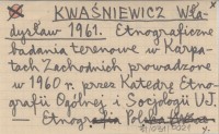 KWAŚNIEWICZ Władysław 1961 Etnograficzne badania terenowe w Karpatach Zachodnich prowadzone w 1960 r. przez Katedrę Etnografii Ogólnej i Socjologii UJ.