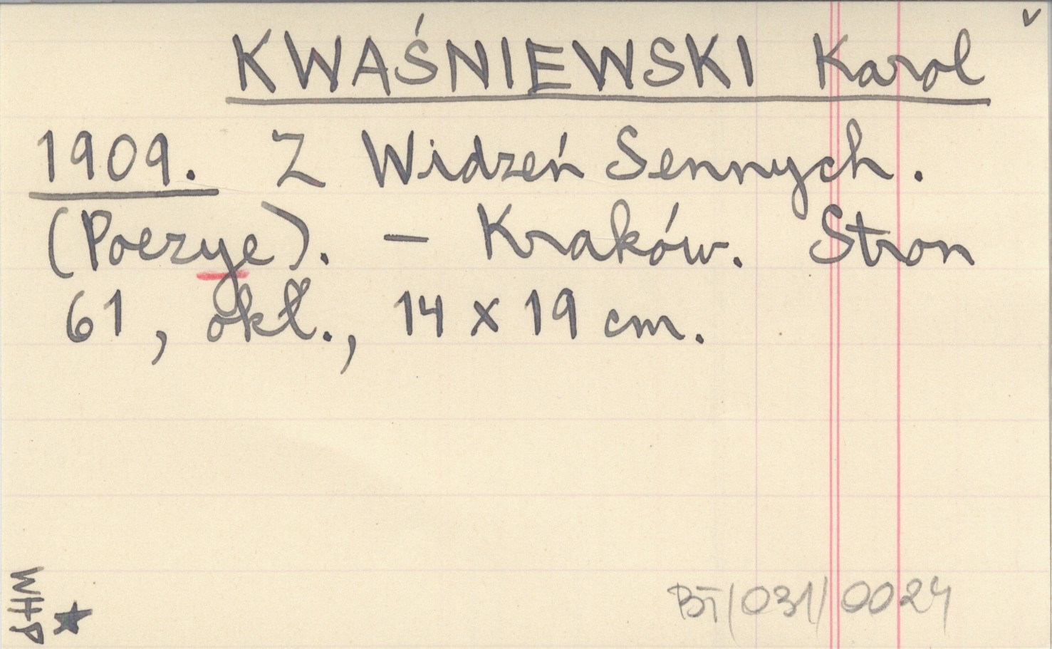 KWAŚNIEWSKI Karol 1909 Z Widzeń Sennych. (Poezye).