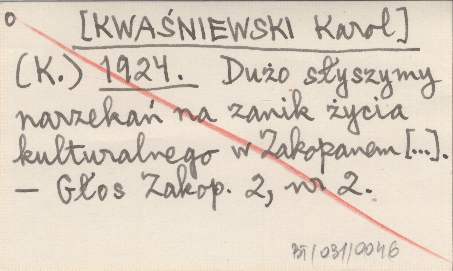 (K.) [KWAŚNIEWSKI Karol] 1924 Dużo słyszymy narzekań na zanik życia kulturalnego w Zakopanem [...].