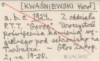 a. b. c. [KWAŚNIEWSKI Karol] 1924 Z oddziału P.T.T. "Gorce". Uroczystość poświęcenia kamienia węgielnego pod schronisko na Turbaczu.