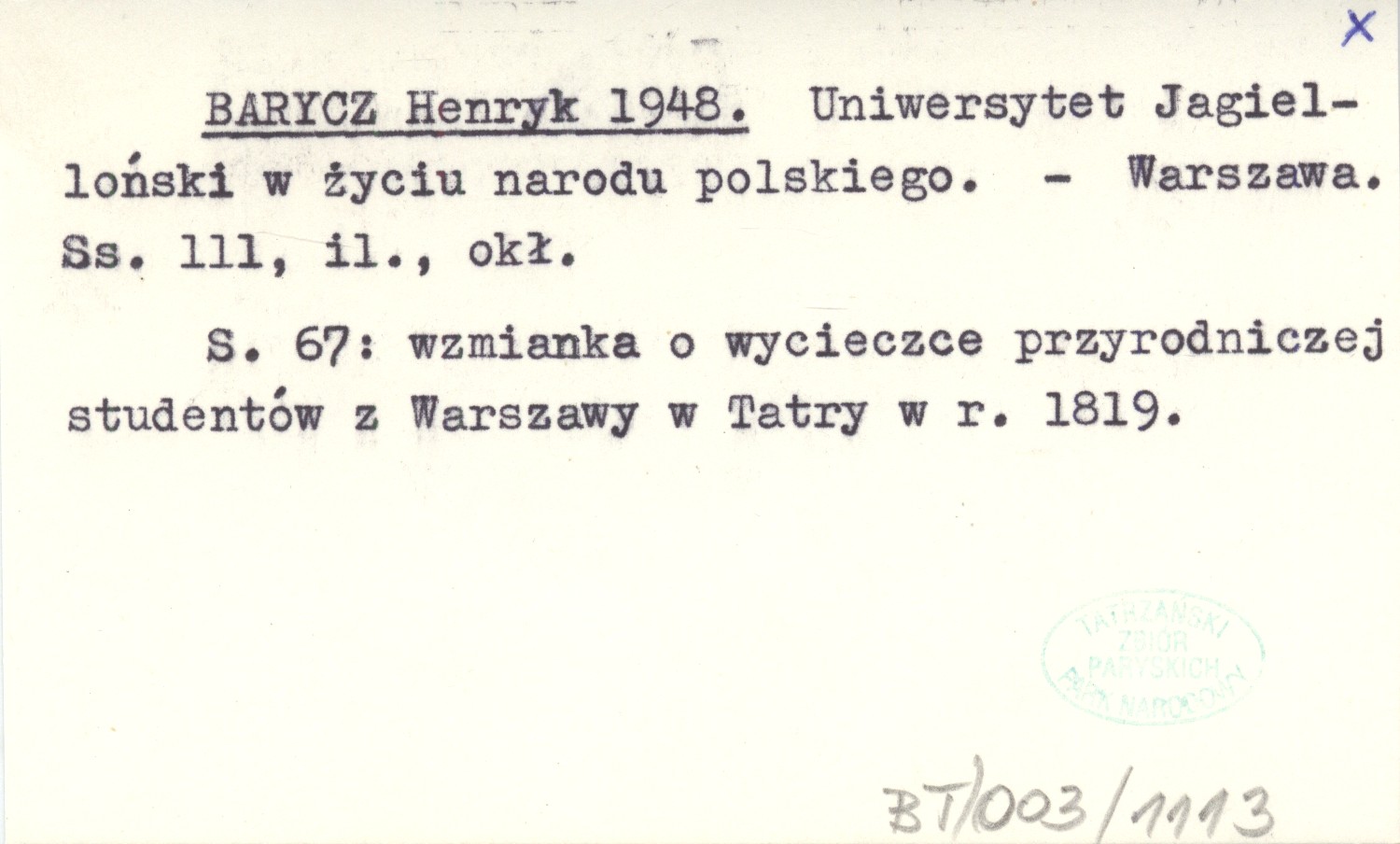BARYCZ Henryk 1948 Uniwersytet Jagielloński w życiu narodu polskiego.