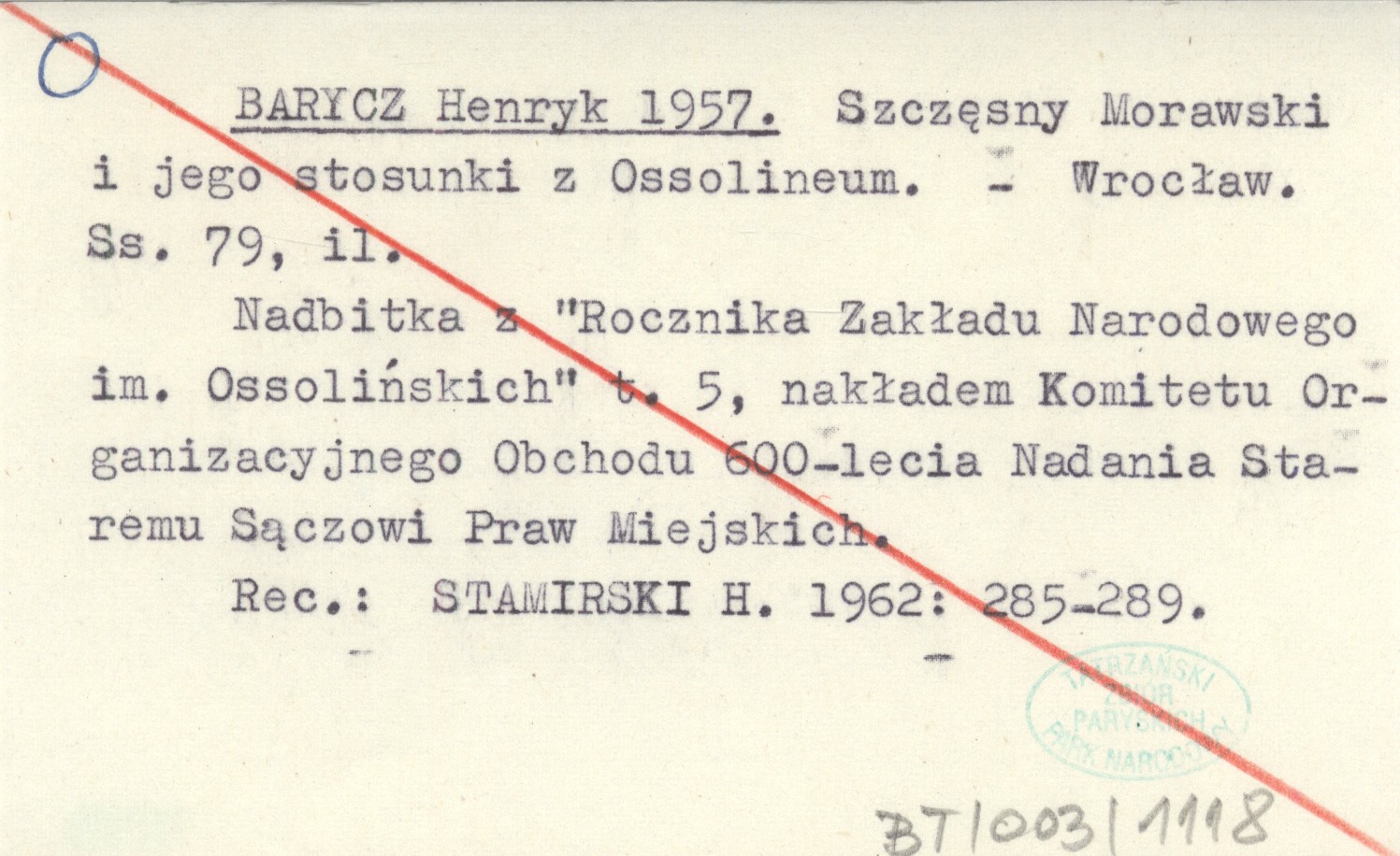 BARYCZ Henryk 1957 Szczęsny Morawski i jego stosunki z Ossolineum.