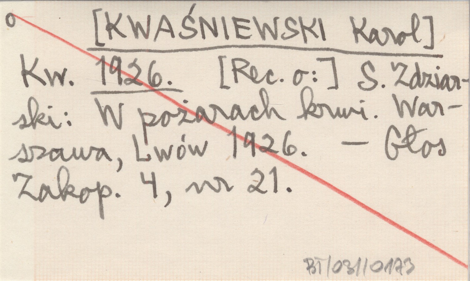 Kw. [KWAŚNIEWSKI Karol] 1926 [Rec. o:] S. Zdziarski: W pożarach krwi. Warszawa, Lwów 1926.