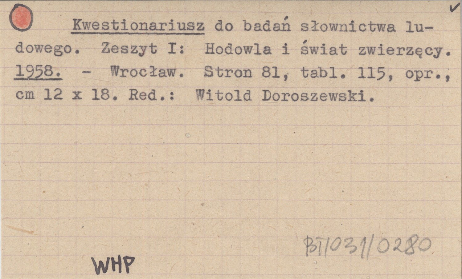 RED: DOROSZEWSKI, Witold. ; Kwestionariusz do badań słownictwa ludowego. Zeszyt I: Hodowla i świat zwierzęcy. 1958