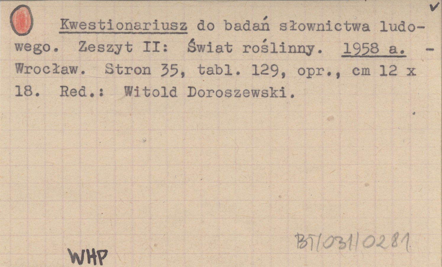 RED: DOROSZEWSKI, Witold. ; Kwestionariusz do badań słownictwa ludowego. Zeszyt II: Świat roślinny. 1958 a