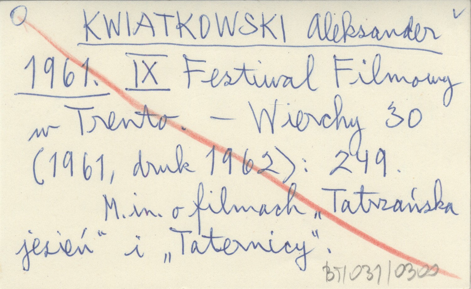 KWIATKOWSKI Aleksander 1961 IX Festiwal Filmowy w Trento.