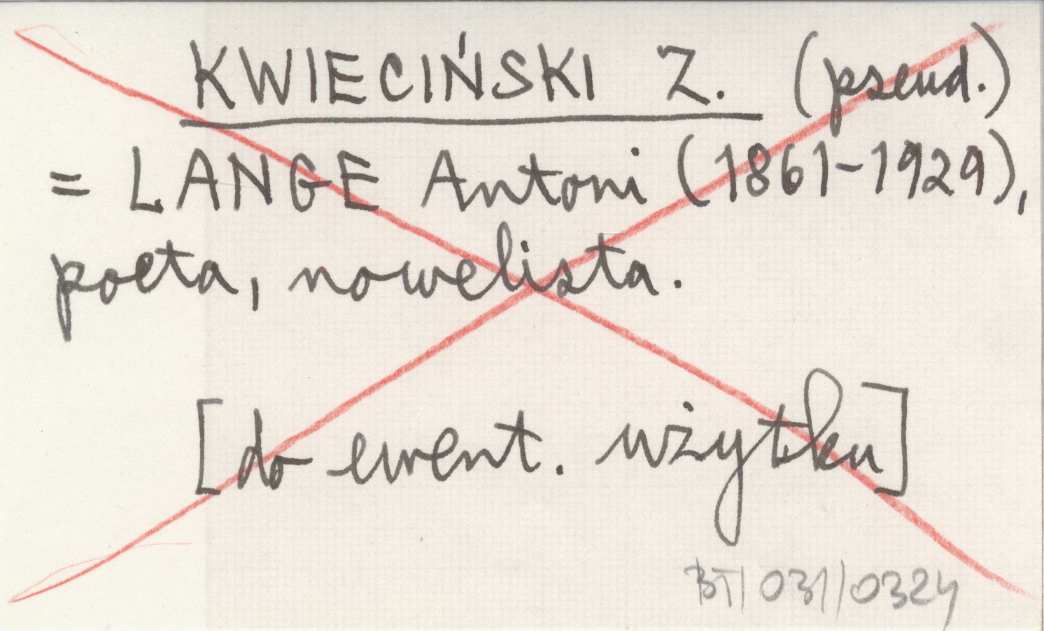 KWIECIŃSKI Z. LANGE Antoni 1861-1929. Poeta, nowelista. [do ewent. użytku]
