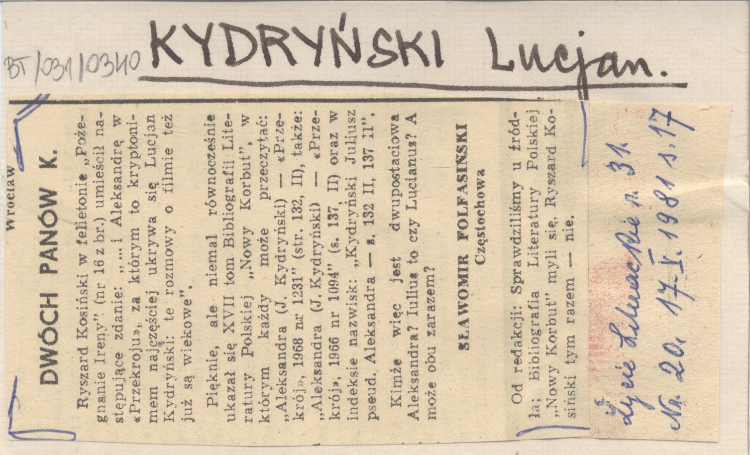Życie Literackie, R. 31, nr 20 (17 V 1981): 17.