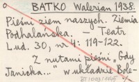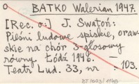 BATKO Walerian 1947 [Rec. o:] J. Swatoń: Piesni ludowe spiskie, orawskie na chór 3-głosowy równy. Łódź 1946.
