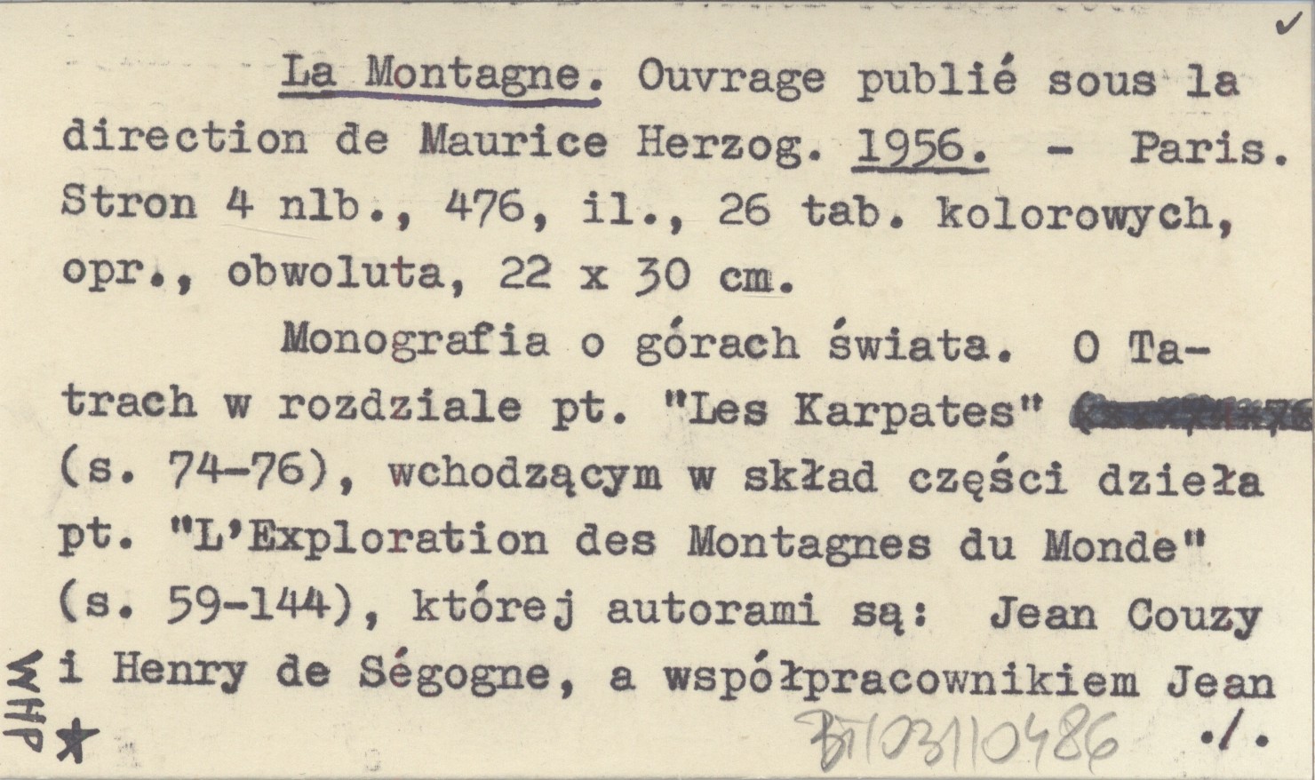 Paris , [4], 476 s., il., 26 k. kol., opr., obw., 22x30 cm. Monografia o górach świata. O Tatrach w rozdziale pt. "Les Karpates" (s. 74-76), wchodzącym w skład części dzieła pt. "L'Exploration des Montagnes du Monde" (s. 59-144), której autorami są: Jean Couzy i Henry de Ségogne, a współpracownikiem Jean Stoupy. REC: [MAŁACHOWSKA Elżbieta] El-M, Wierchy (Kraków) 26 (1957): 276-277.