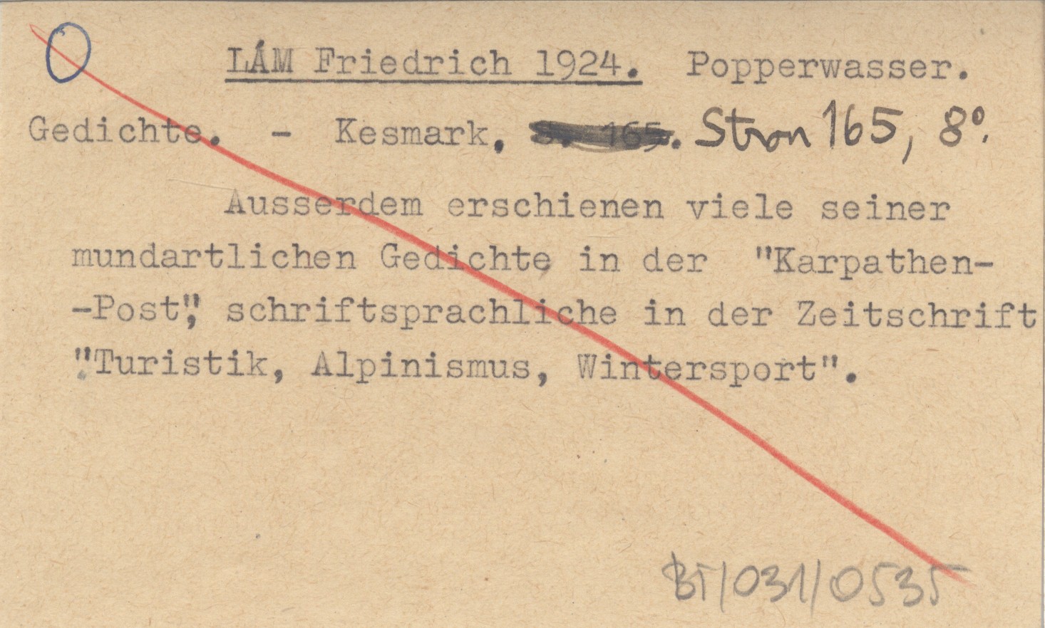 Kesmark , [2], 165, [2] s., okł., 15x22 cm, 8°. Wiersze, częściowo w dialekcie Niemców spiskich.