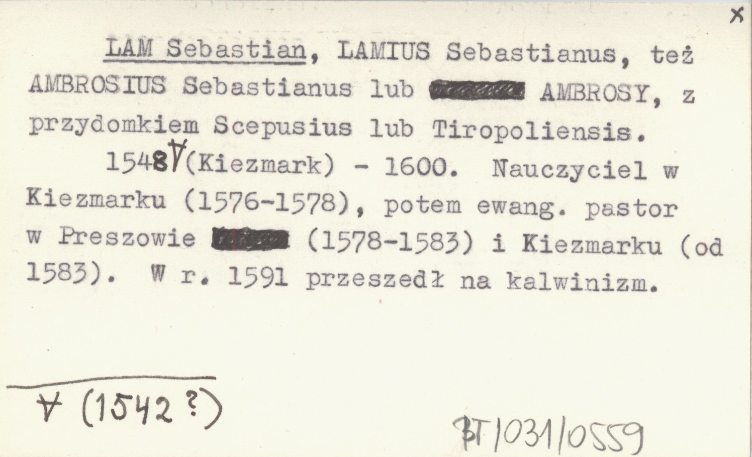 LAMIUS Sebastianus, też AMBROSIUS Sebastianus lub AMBROSY, z przydomkiem Scepusius lub Tiropoliensis. 1548 (1542?) (Kiezmark)-1600. Nauczyciel w Kiezmarku (1576-1578), potem ewangelicki pastor w Preszowie (1578-1583) i Kiezmarku (od 1583 r.). W r. 1591 przeszedł na kalwinizm.