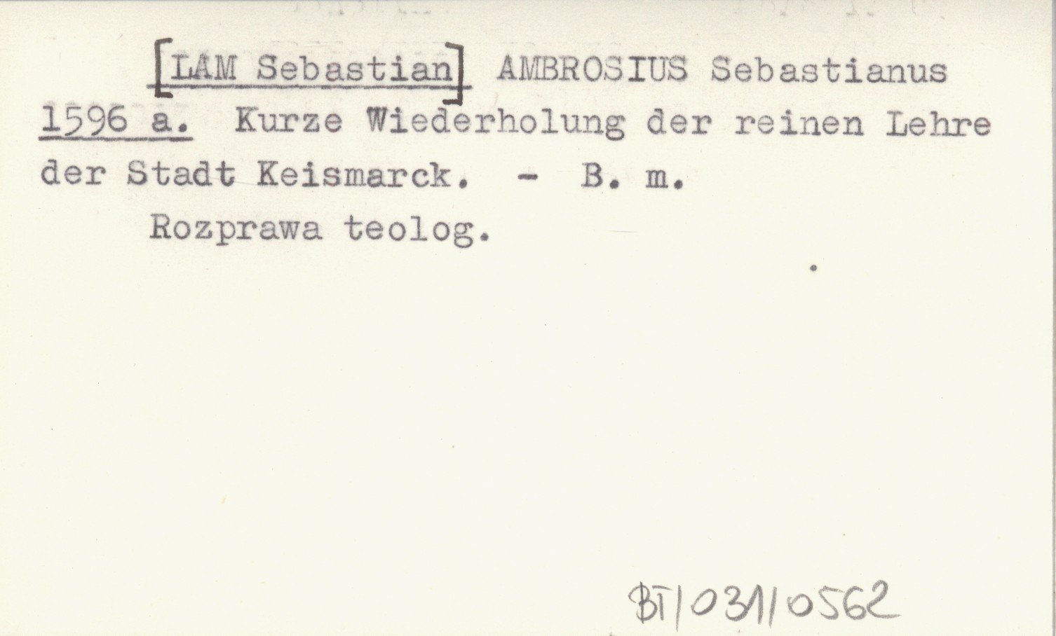 AMBROSIUS Sebastianus [LAM Sebastian] 1596 a Kurze Wiederholung der reinen Lehre der Stadt Keismarck.