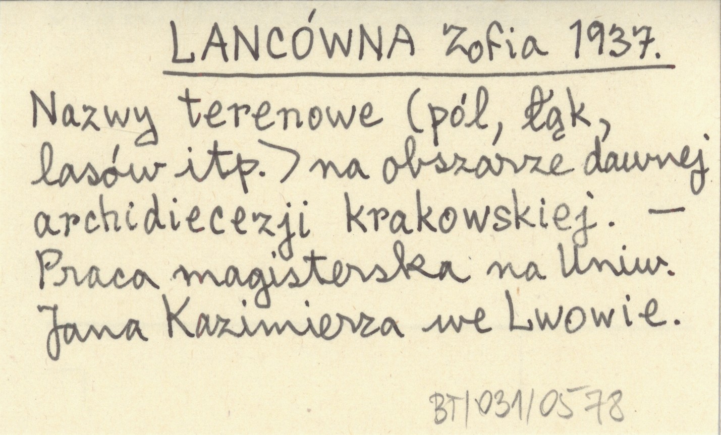 LANCÓWNA Zofia 1937 Nazwy terenowe (pól, łąk, lasów itp.) na obszarze dawnej archidiecezji krakowskiej.