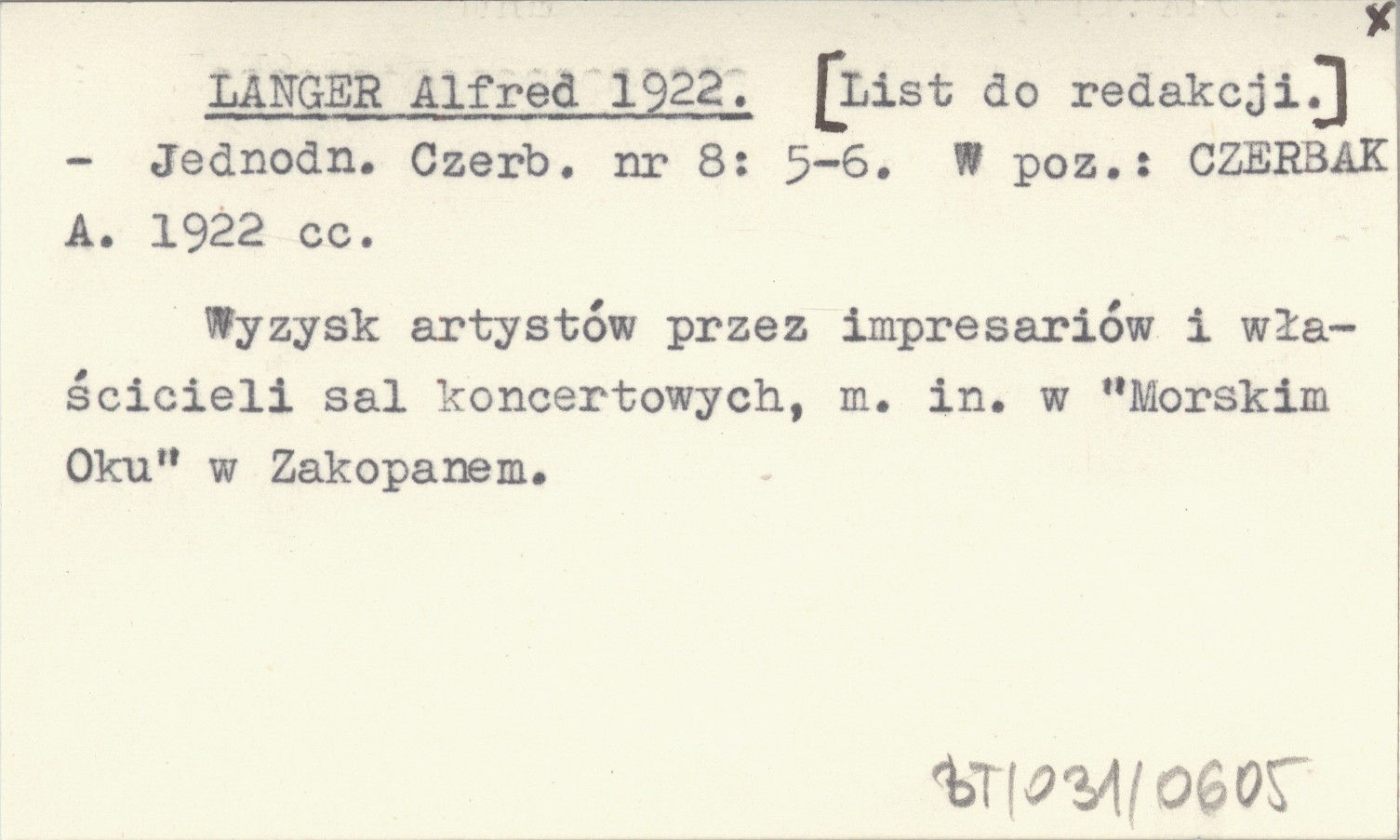 Jednodniówka Czerbaka, Nr 8: 5-6. Wyzysk artystów przez impresariów i właścicieli sal koncertowych, m. in. w "Morskim Oku" w Zakopanem. W poz.: CZERBAK A. 1922 cc