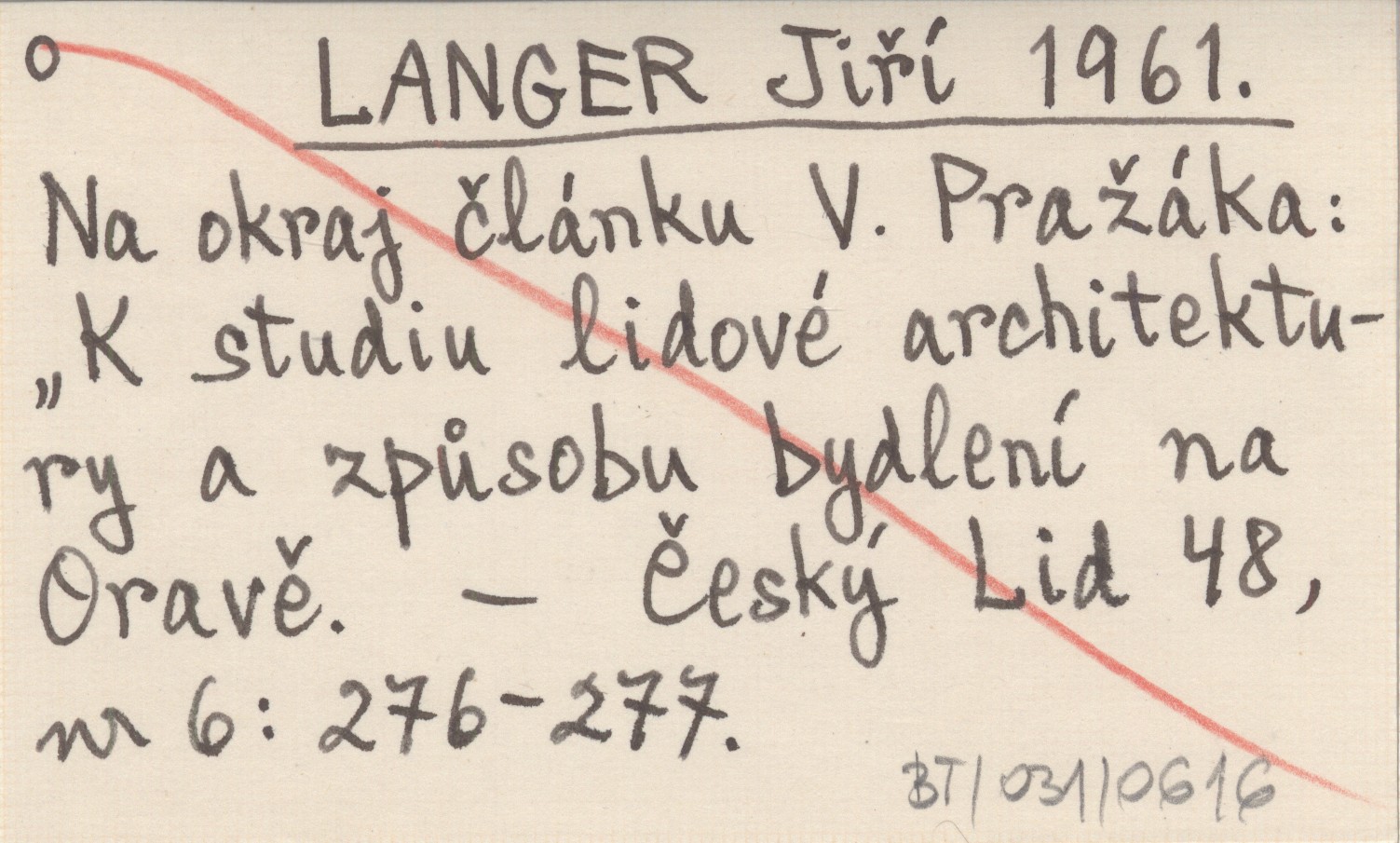 LANGER Jiří 1961 Na okraj článku V. Pražáka: "K studiu lidové architektury a způsobu bydlení na Oravě".