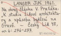 LANGER Jiří 1961 Na okraj článku V. Praľáka: "K studiu lidové architektury a způsobu bydlení na Oravě".