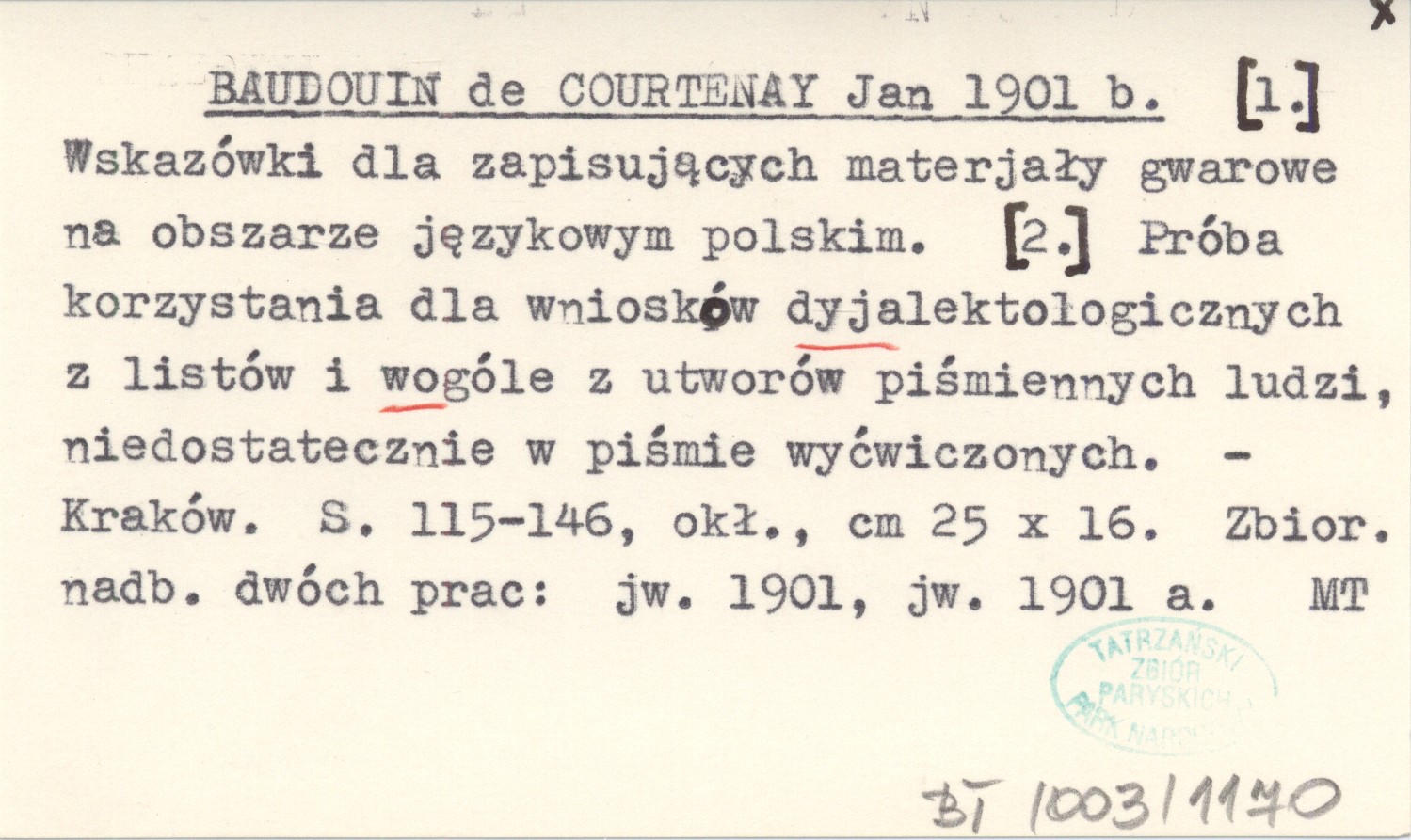 BAUDOUIN de COURTENAY Jan 1901 b [1.] Wskazówki dla zapisujących materjały gwarowe na obszarze językowym polskim. [2.] Próba korzystania dla wniosków dyjalektologicznych z listów i wogóle z utworów piśmiennych ludzi, niedostatecznie w piśmie wyćwiczonych.