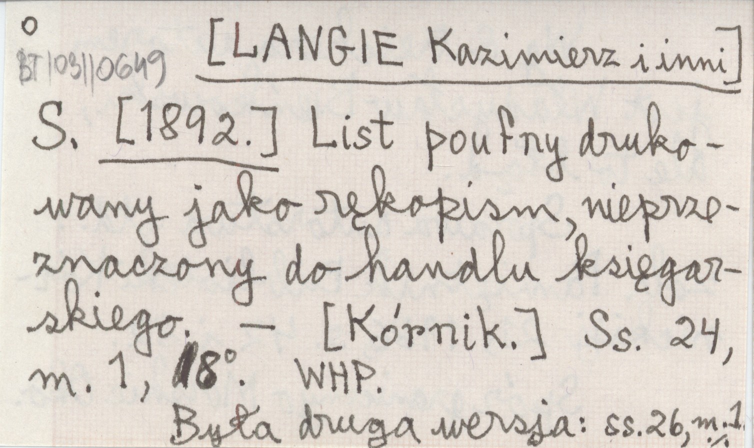 S. [LANGIE Kazimierz] i in. ; [1892] List poufny drukowany jako rękopism, nieprzeznaczony do handlu księgarskiego.