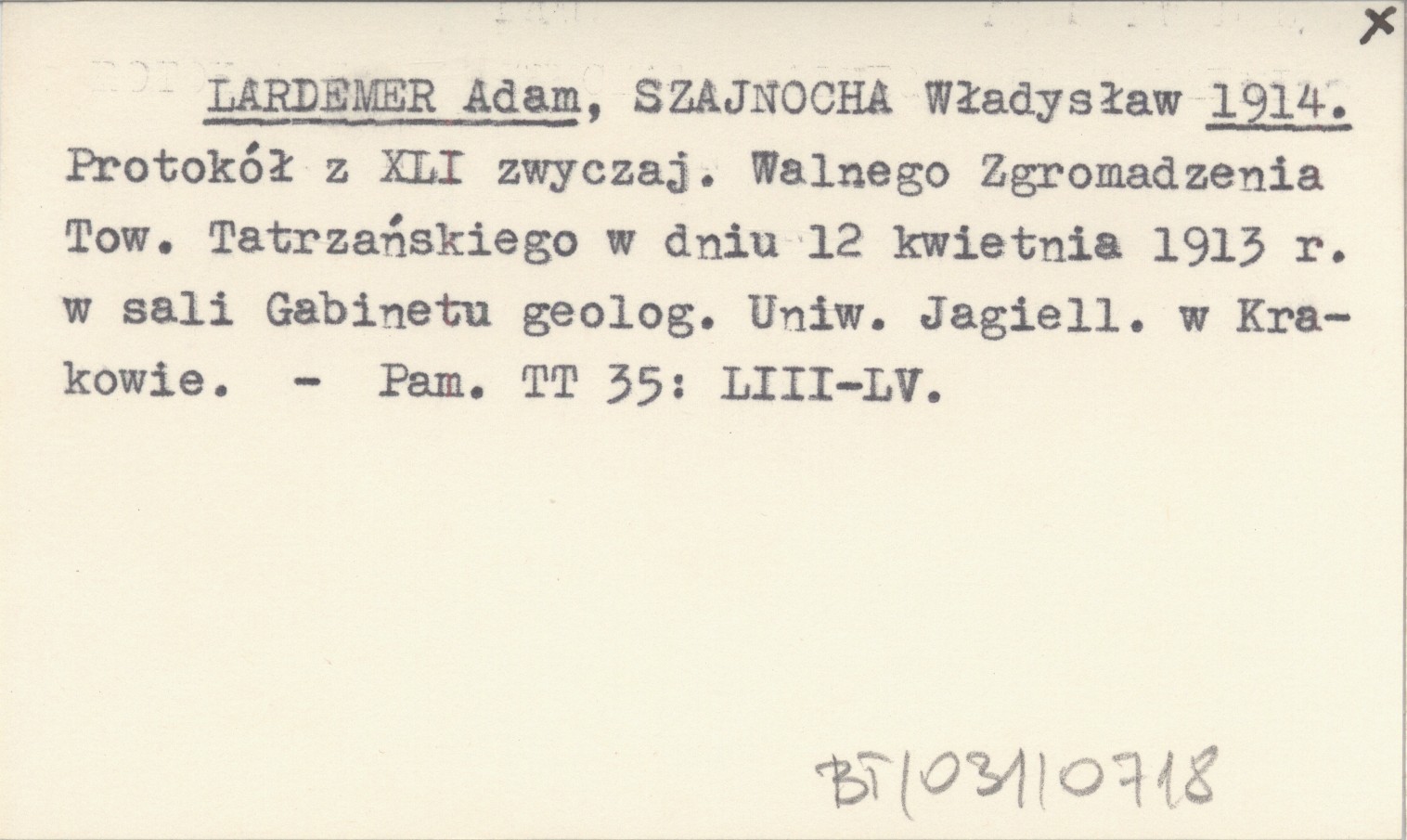 LARDEMER Adam SZAJNOCHA, Władysław. ; 1914 Protokół z XLI zwyczaj. Walnego Zgromadzenia Tow. Tatrzańskiego w dniu 12 kwietnia 1913 r. w sali Gabinetu geolog. Uniw. Jagiell. w Krakowie.