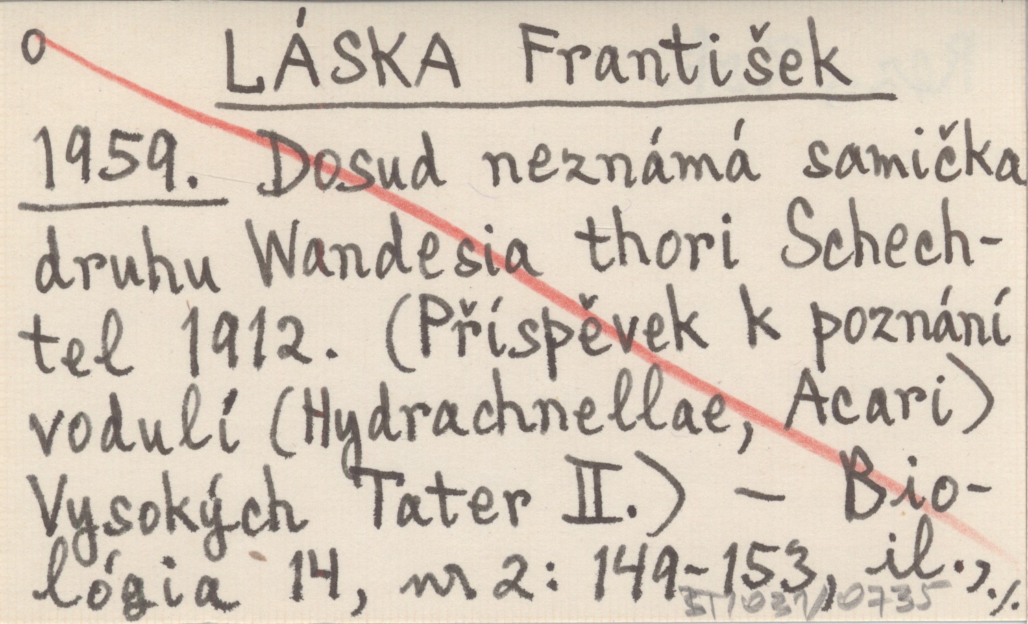 LÁSKA Frantiąek 1959 Dosud neznámá samička druhu Wandesia thori Schechtel 1912. (Příspěvek k poznání vodulí (Hydrachnellae, Acari) Vysokých Tater II).