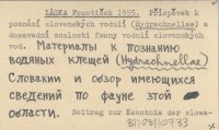 LÁSKA František 1955 Příspěvek k poznání slovenských vodulí (Hydrachnellae) a dosavadní znalosti fauny vodulí slovenských vod. Materialy k poznaniju vodjanych klešej (Hydrachnellae) Slovakii i obzor imejušichcja svedenij po faune ztoj oblasti. Beitrag zur Kenntnis der slowakischen Wassermilben (Hydrachnellae) und die bisherigen Erkenntnise der Wassermilbenfauna der Slowakei.