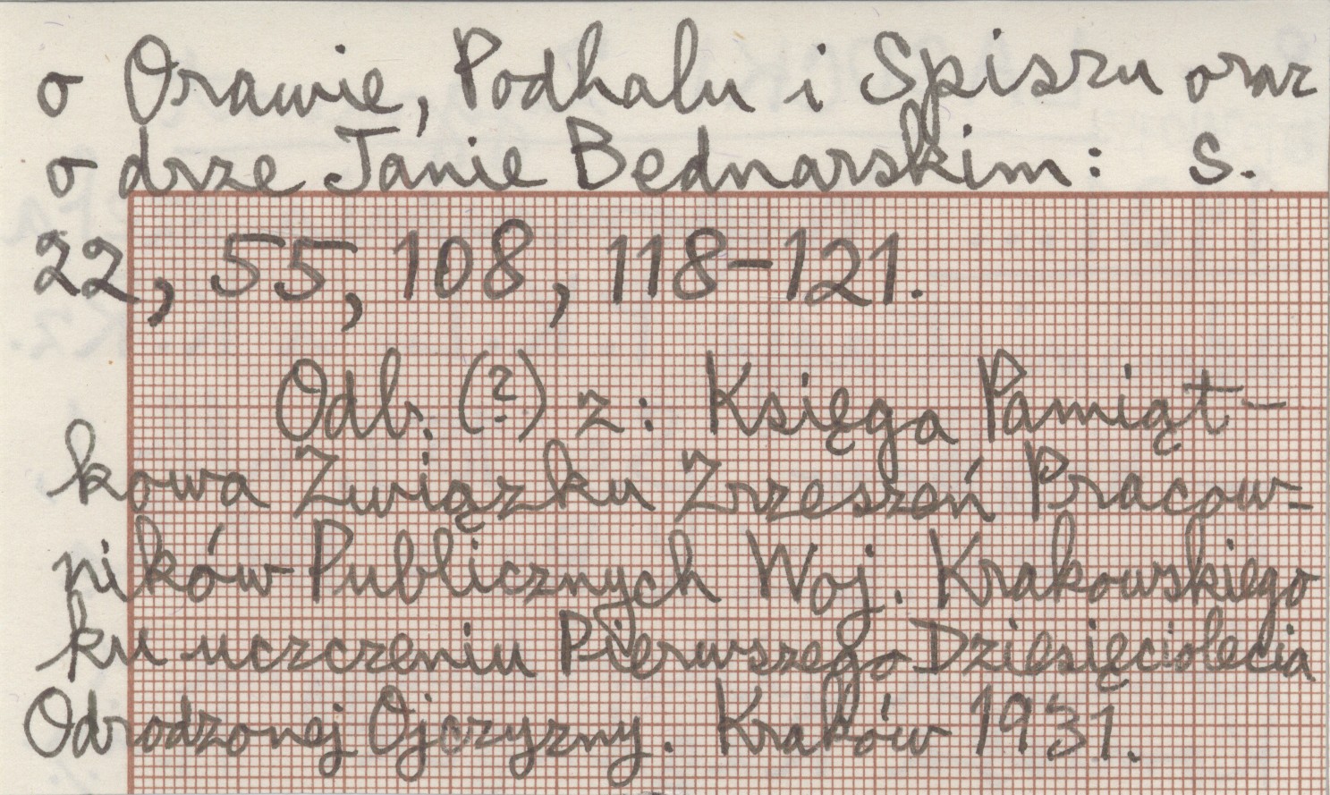 Kraków , 154, [1] s., 8°. P.K.L. i K.Rz. = Polska Komisja Likwidacyjna i Komisja Rządząca. M. in. o Orawie, Podhalu i Spiszu oraz o drze Janie Bednarskim: s. 22, 55, 108, 118-121. Odb. (?) z: Księga Pamiątkowa Zawiązku Zrzeszeń Pracowników Publicznych Woj. Krakowskiego ku uczczeniu Pierwszego Dziesięciolecia Odrodzonej Ojczyzny. Kraków 1931.
