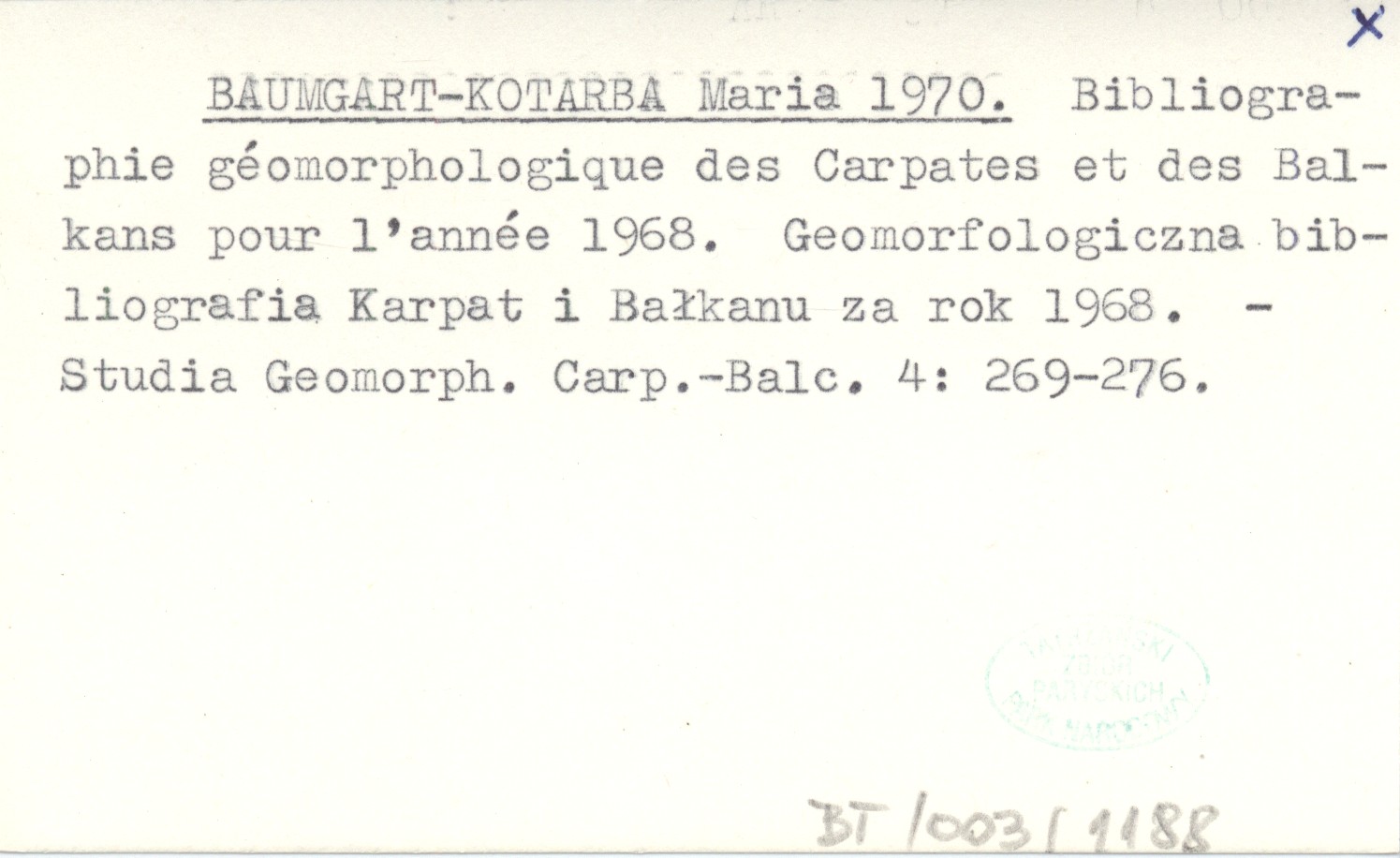 BAUMGART-KOTARBA Maria 1970 Bibliographie géomorphologique des Carpates et des Balkans pour l'année 1968. Bibliografia geomorfologiczna Karpat i Bałkanu za rok 1968.