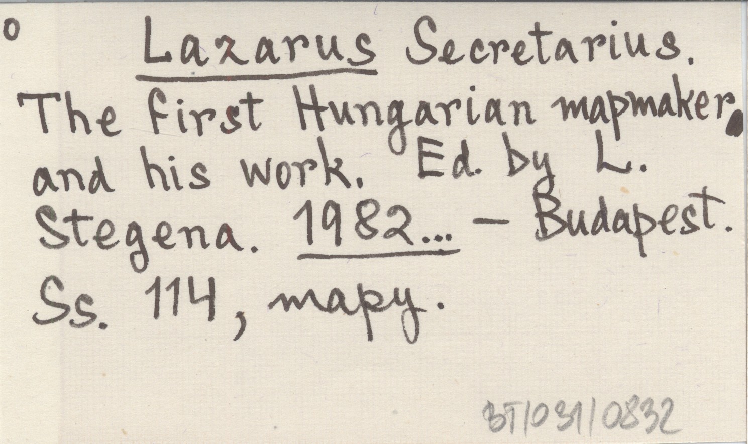 Lazarus Secretarius. The first Hungarian mapmaker and his work. Ed. by L. Stegena. 1982...