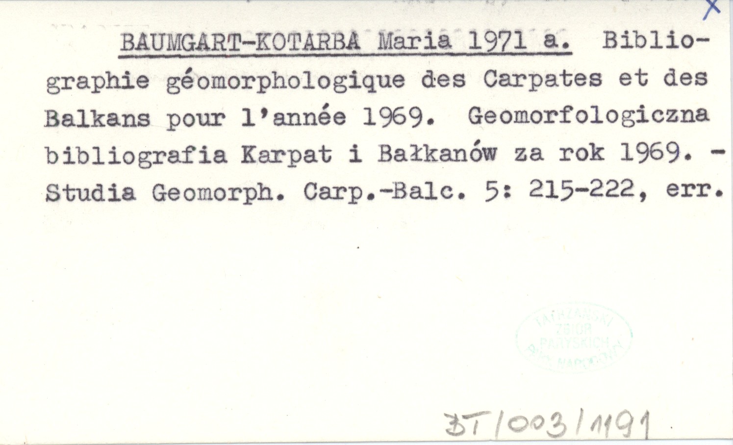 BAUMGART-KOTARBA Maria 1971 a Bibliographie géomorphologique des Carpates et des Balkans pour l'année 1969. Bibliografia geomorfologiczna Karpat i Bałkanów za rok 1969.