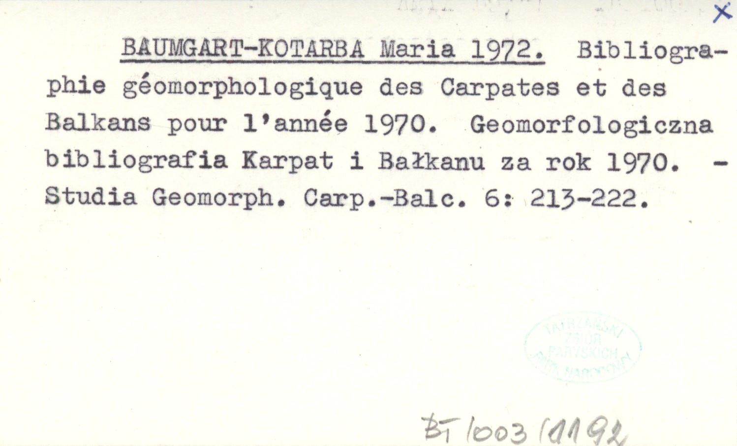 BAUMGART-KOTARBA Maria 1972 Bibliographie géomorphologique des Carpates et des Balkans pour l'année 1970. Bibliografia geomorfologiczna Karpat i Bałkanu za rok 1970.