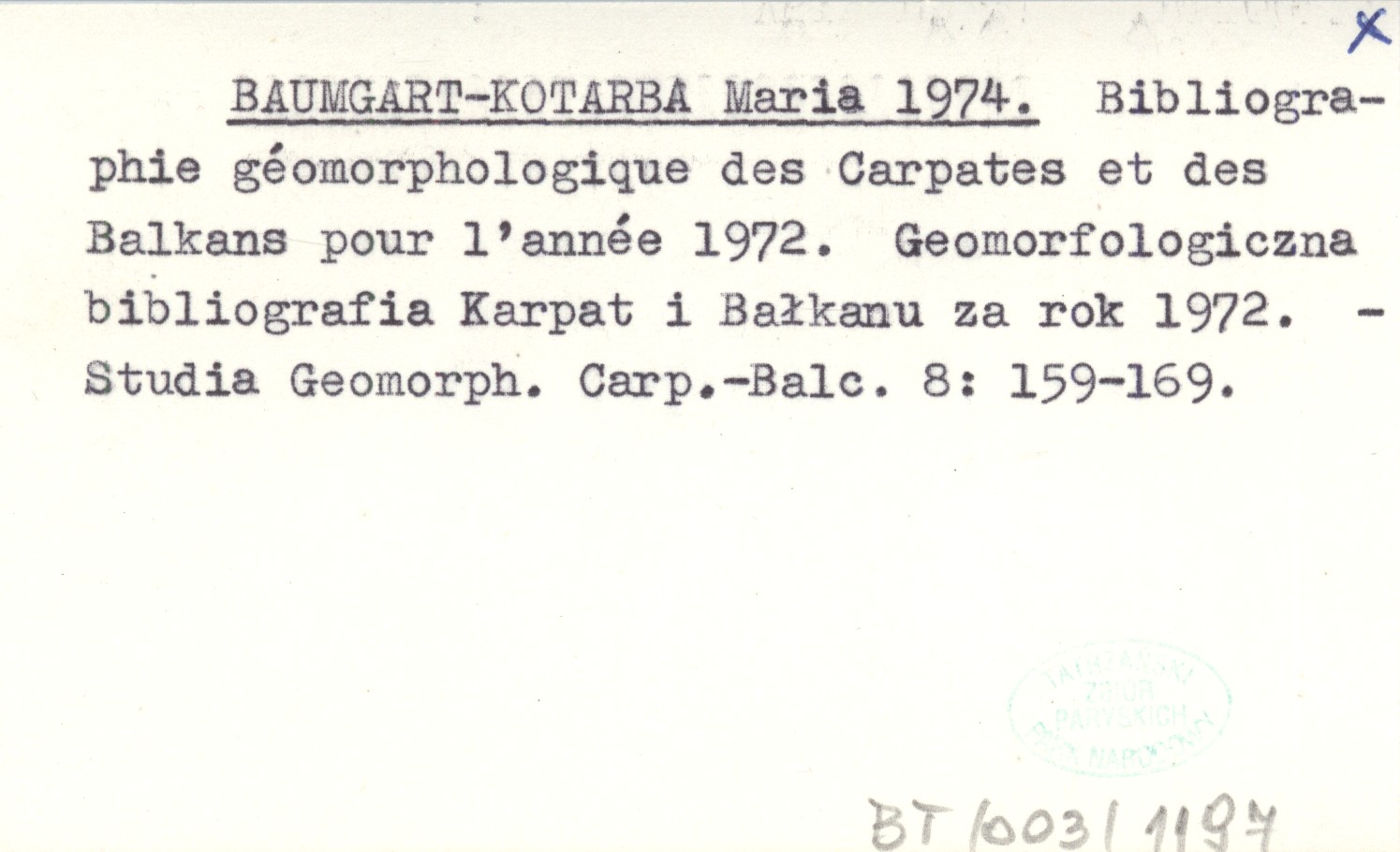 BAUMGART-KOTARBA Maria 1974 Bibliographie géomorphologique des Carpates et des Balkans pour l'année 1972. Bibliografia geomorfologiczna Karpat i Bałkanu za rok 1972.