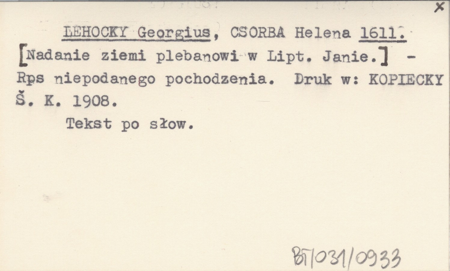 LEHOCKY Georgius CSORBA, Helena. ; 1611 [Nadanie ziemi plebanowi w Lipt. Janie.]