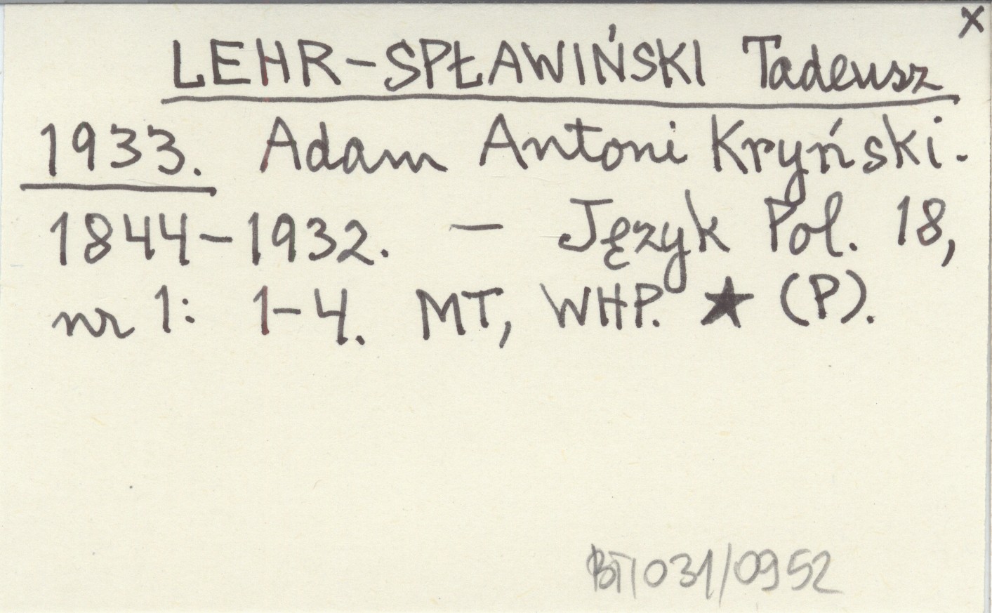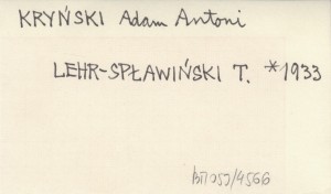 LEHR-SPŁAWIŃSKI Tadeusz 1933 Adam Antoni Kryński. 1844-1932.