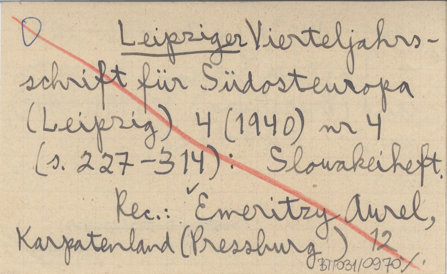 Leipzig , 4 (1940) nr 4: 227-314. Slowakeiheft. REC: EMERITZY Aurel, Karpathenland (Pressburg) 12 (1941-1942), nr 2: 226-227. ; Lipták Johann, Karpatenland (Pressburg) 12 (1941-1942), nr 2: 227-228.