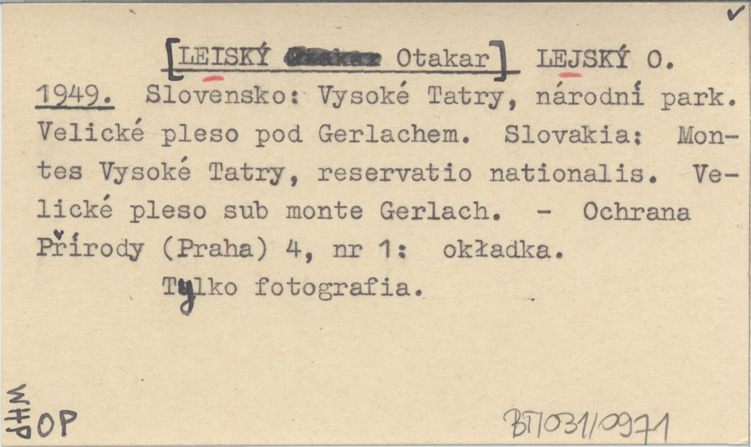 LEJSKÝ O. [LEISKÝ Otakar] 1949 Slovensko: Vysoké Tatry, národní park. Velické pleso pod Gerlachem. Slovakia: Montes Vysoké Tatry, reservatio nationalis. Velické pleso sub monte Gerlach.