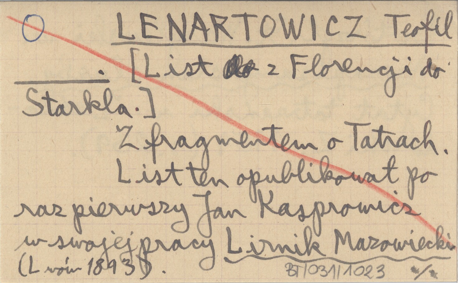 , Z fragmentem o Tatrach. List ten opublikował po raz pierwszy Jan Kasprowicz w swojej pracy Lirnik Mazowiecki (Lwów 1893). Powtórzył St. Wasylewski w: Niezapisany stan służby. Cytat tatrzański w: Leśnodorski Z. 1959 (s. 239).
