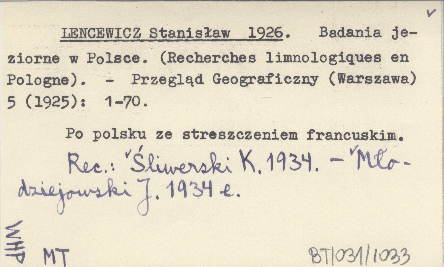 LENCEWICZ Stanisław 1926 Badania jeziorne w Polsce. (Recherches limnologiques en Pologne).