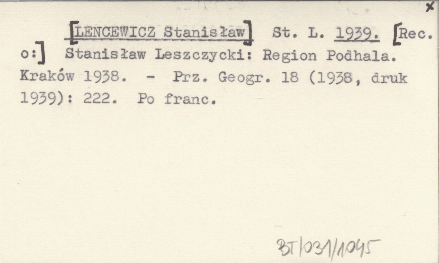 St. L. [LENCEWICZ Stanisław] 1939 [Rec. o:] Stanisław Leszczycki: Region Podhala. Kraków 1938.