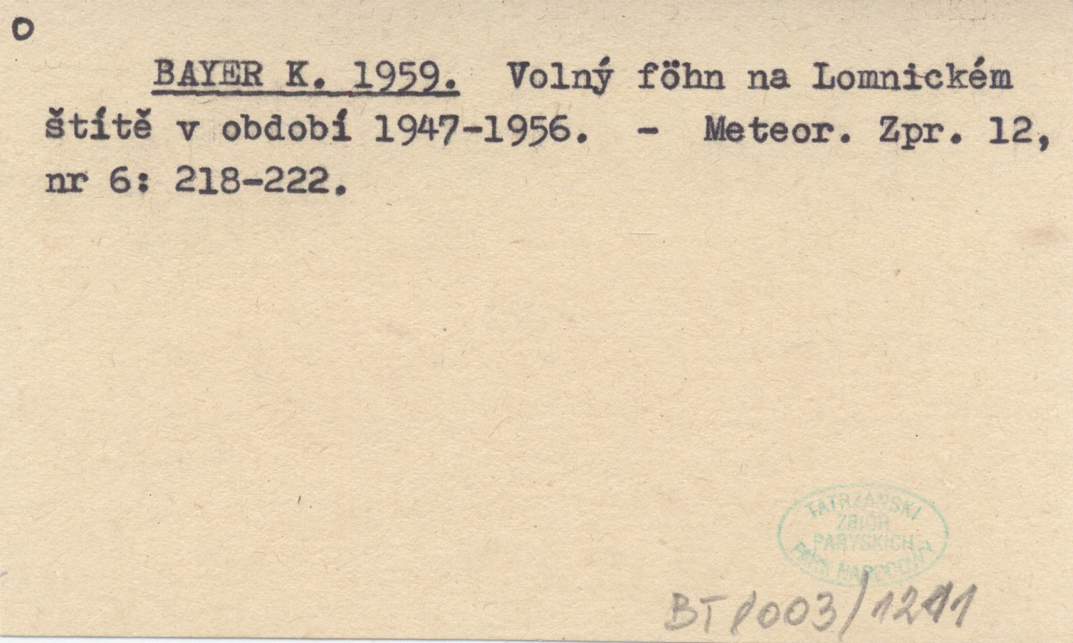 BAYER K. 1959 Volný föhn na Lomnickém štítě v období 1947-1956.