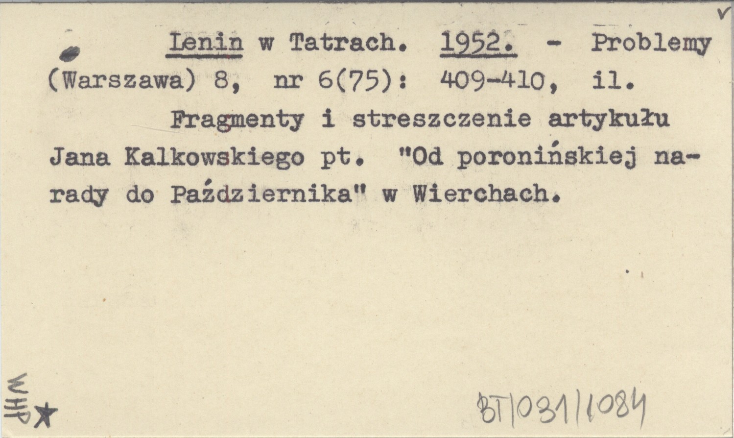 Problemy (Warszawa) , 8, nr 6 (75): 409-410, il. Fragmenty i streszczenia artykułu Jana Kalkowskiego pt. "Od poronińskiej narady do Października" w Wierchach.