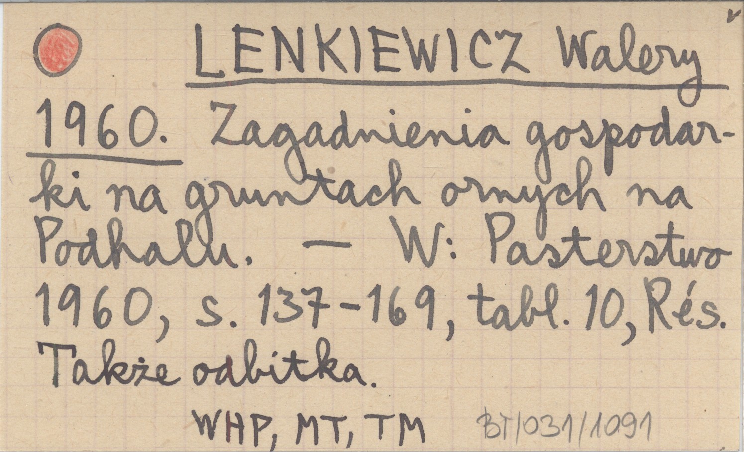 LENKIEWICZ Walery 1960 Zagadnienia gospodarki na gruntach ornych na Podhalu.
