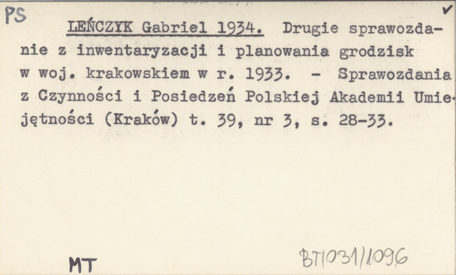 LEŃCZYK Gabriel 1934 Drugie sprawozdanie z inwentaryzacji i planowania grodzisk w woj. krakowskiem w r. 1933.