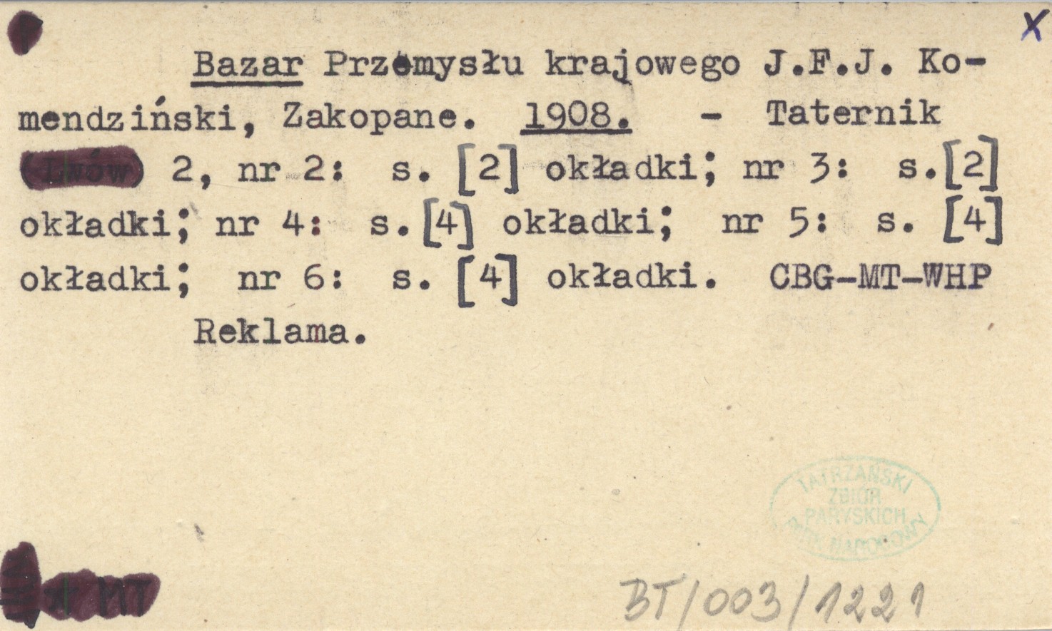 Bazar Przemysłu krajowego J. F. J. Komendziński, Zakopane. 1908