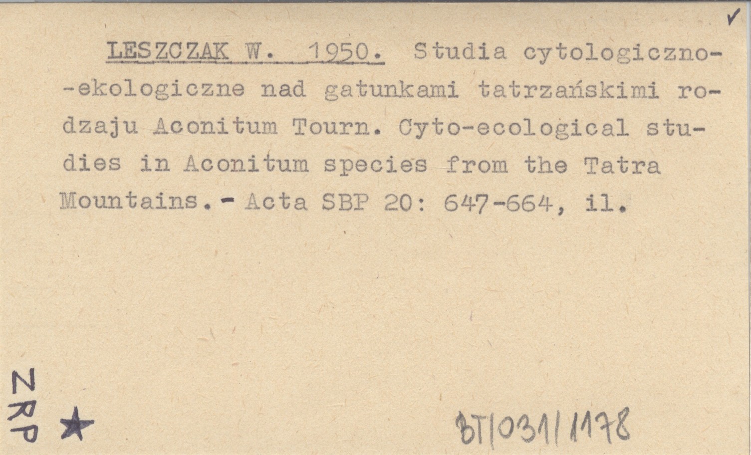 LESZCZAK W. 1950 Studia cytologiczno-ekologiczne nad gatunkami tatrzańskimi rodzaju Aconitum Tourn. Cyto-ecological studies in Aconitum species from the Tatra Mountains.