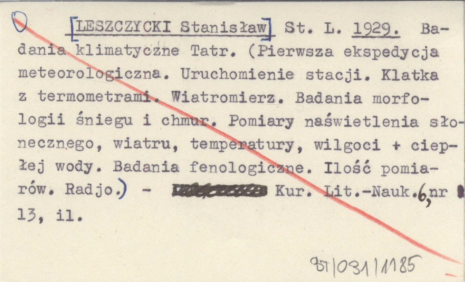St. L. [LESZCZYCKI Stanisław] 1929 Badania klimatyczne Tatr. (Pierwsza ekspedycja meteorologiczna. Uruchomienie stacji. Klatka z termometrami. Wiatromierz. Badania morfologii śniegu i chmur. Pomiary naświetlenia słonecznego, wiatru, temperatury, wilgoci + ciepłej wody. Badania fenologiczne. Ilość pomiarów. Radjo.)