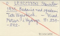 LESZCZYCKI Stanisław 1931 Badania nad opadami Tatr Wysokich.